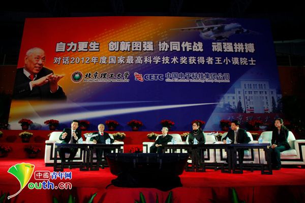 这场“对话2012年国家最高科学技术奖获得者王小谟院士报告会”是由北京理工大学和中国电子科技集团公司(以下简称中国电科)联合举办。会上,王小谟院士与四位嘉宾一起和青年学生共话科研。